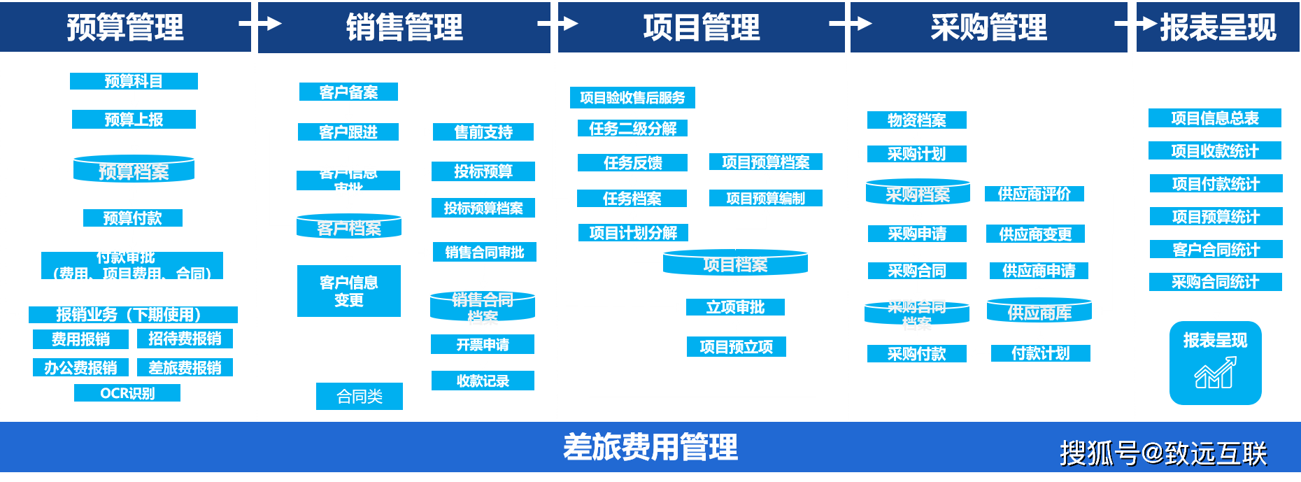 在应用层,贯穿差旅费用管理、预算管理、销售管理、项目管理、采购管理、报表呈现六大业务场景,实现业务管控闭环。