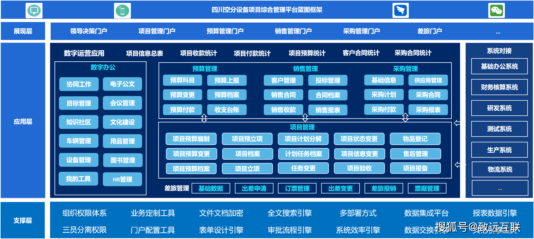 在展现层,大多数表现在门户建设,包括领导决策门户、项目管理门户、预算管理门户、销售管理门户、采购管理门户。